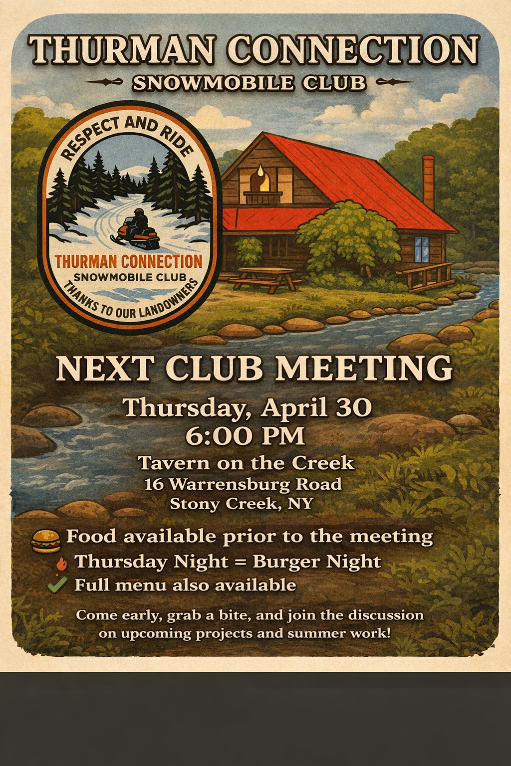 Monthly club meeting, 6pm at the Groomer Barn, Agenda Roll call, Reading and approval of the minutes, Treasures report, report of board of directors, Old Business, New Business, Good and welfare, adjournment